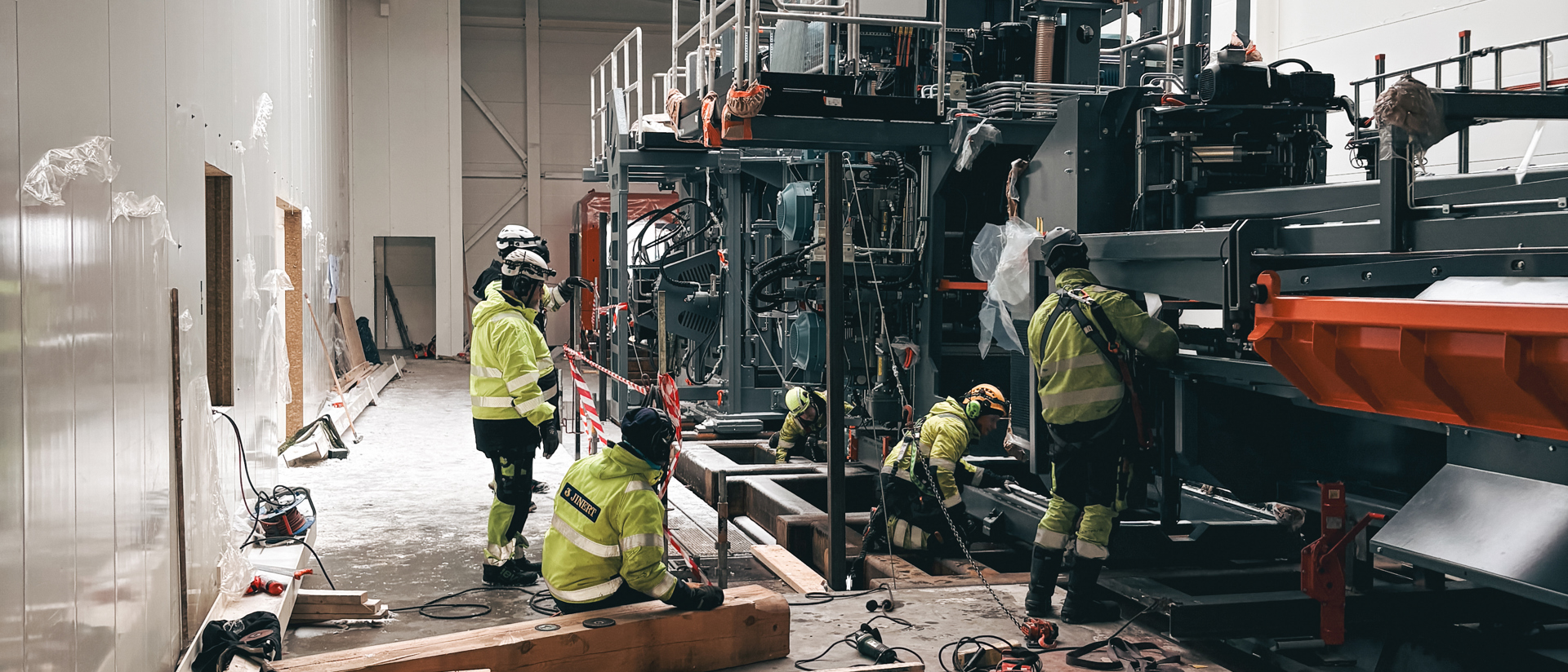Efter svetsningen delades fundamentet upp i sektioner för transport, en process som NMI-Teknik även ansvarade för. På plats monterades sektionerna åter samman till ett helt fundament. För att möjliggöra inlyftet transporterades sektionerna in via taket, som därefter stängdes. När fundamentet var på plats öppnades taket igen för att vi skulle kunna assistera vid inlyftet av den nya sågmaskinen från HewSaw.